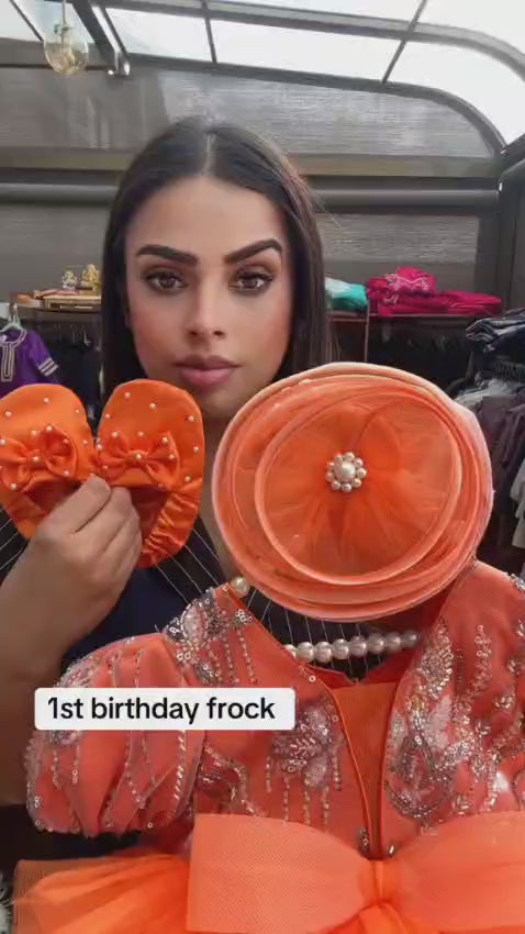 - Elegant orange birthday frock designed specially for your baby girl’s 1st birthday.