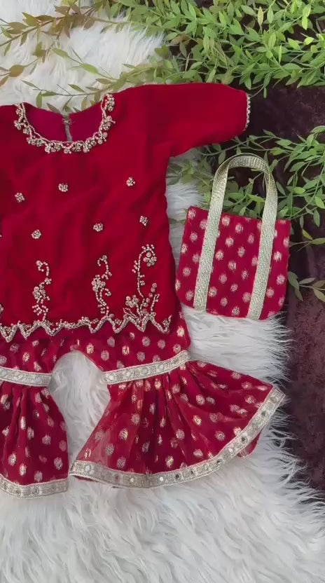 Key Specifications Color: Rich Red Fabric (Kurta/Shirt): Soft Velvet Fabric (Gharara/Pants): Brocade Work/Embroidery: Intricate Zari and Sequin Handwork Style: Traditional Gharara Suit Matching Net Dupatta Includes Decorative Potli Bag