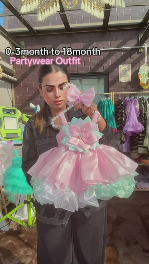 Baby Pink & Aqua Blue Partywear Frock with Floral Bow Design